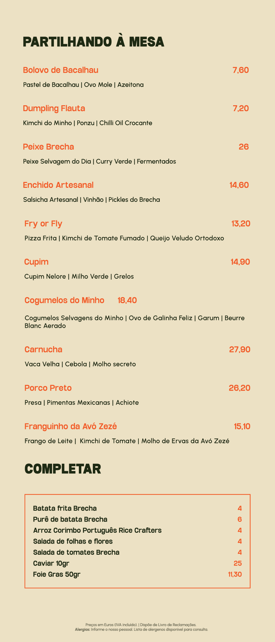 Pratos para partilhar e complementos